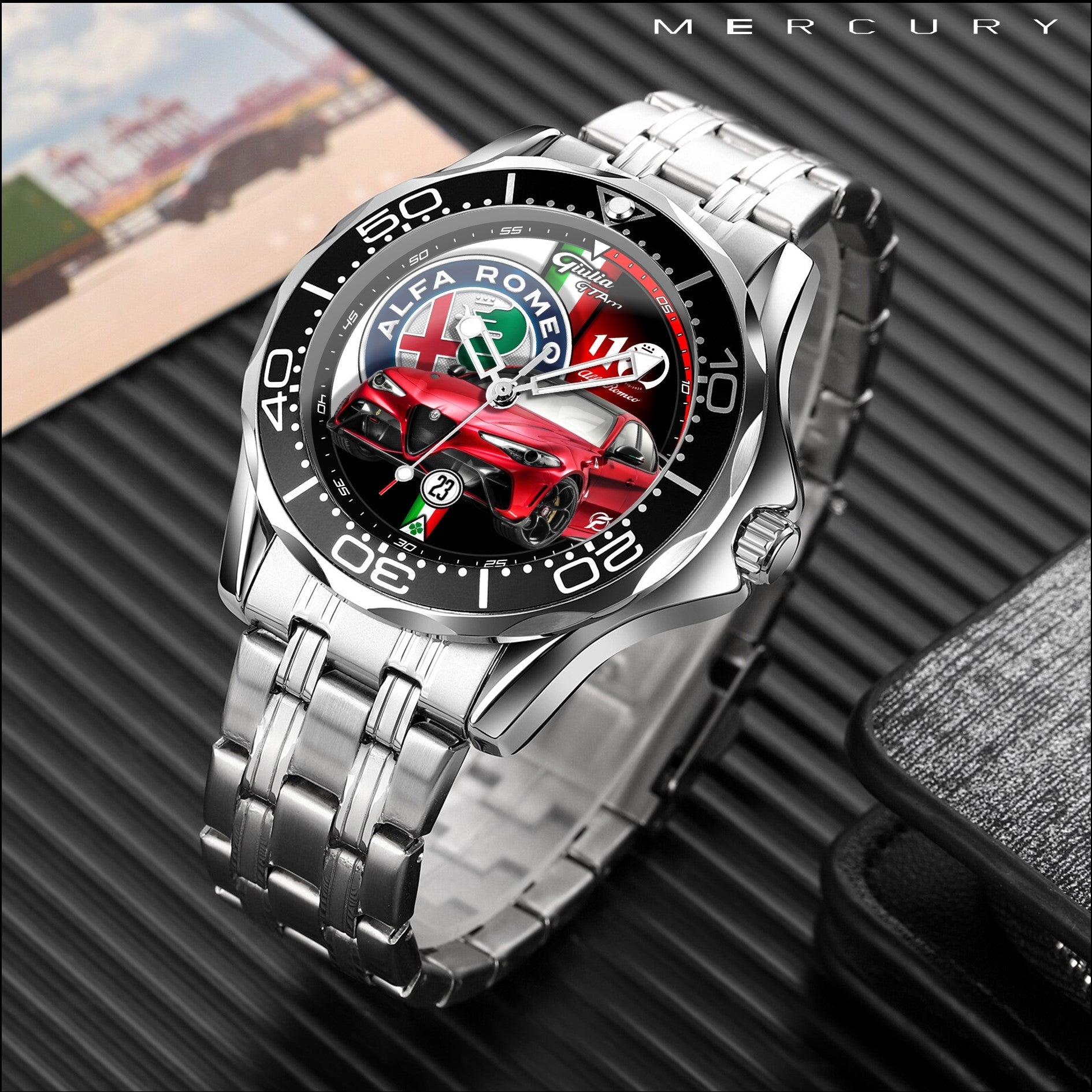 Caratteristiche tecniche dell'orologio Mercury: confezione in cartone rivestito inciso a laser. Il quadrante presenta una superficie stampata con indici sovraesposti. Design unisex. La cassa ha un diametro di 43 mm ed è realizzata in acciaio inossidabile. Il cinturino, anch'esso in acciaio inossidabile, ha una larghezza di 20 mm e utilizza un sistema di chiusura con gancio rapido. L'orologio è alimentato da un movimento al quarzo Epson a batteria. Il peso totale è di 136 grammi e offre una resistenza all'acqua fino a 3 ATM.